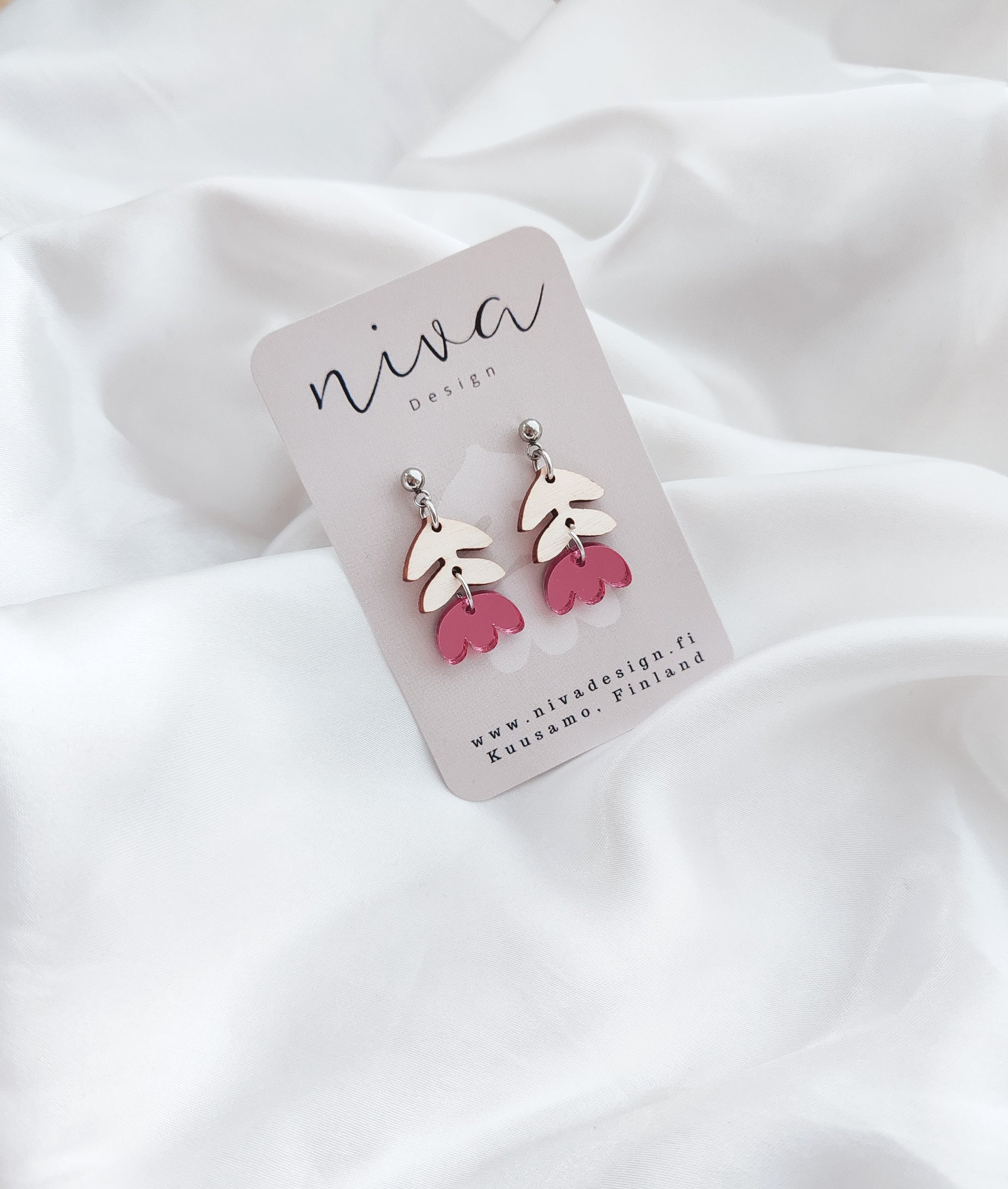 Kukka Nurin Kurin Korvakorut, pinkki peiliakryyli ja koivuvaneri.